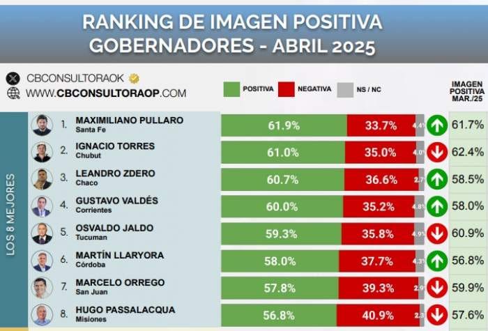 Los tres gobernadores mejor valorados de este mes por sus coprovincianos son: Maximiliano Pullaro (Santa Fe) liderando con un 61,9% de imagen positiva, seguido por Ignacio Torres (Chubut) con un 61,0%, y en tercer lugar Leandro Zdero (Chaco) con un 60,7%. Y con un 60%, en el cuarto lugar se ubica el correntino Gustavo Valdés.