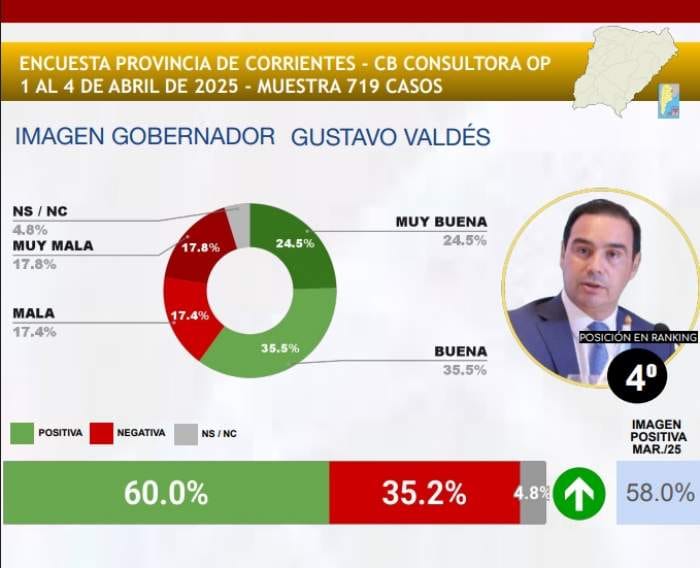 Con un 60% de imagen positiva, el Mandatario correntino se ubica en cuarto lugar en la medición mensual que hace la consultora CB sobre la mejor imagen de los mandatarios provinciales e intendentes de todo el país. El santafesino Maximiliano Pullaro está primero, segundo el chubutense Ignacio Torres y Leandro Zdero, del Chaco, tercero. Tassano está tercero entre los intendentes