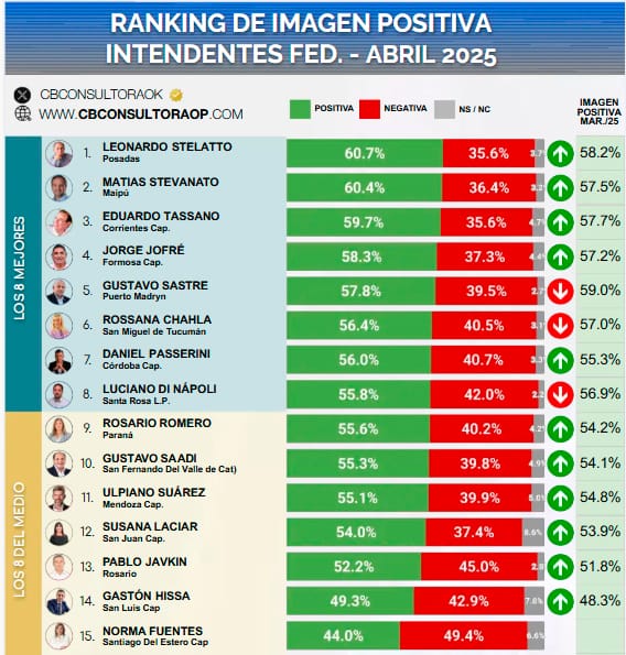 Los tres intendentes mejor valorados del mes de abril de 2025 por sus vecinos son: en primer lugar, Leonardo Stelatto (Posadas) con un 60,7% de aprobación, seguido por Matías Stevanato (Maipú) con un 60,4%, y en tercer lugar Eduardo Tassano (Corrientes Capital) con un 59,7% de imagen positiva.