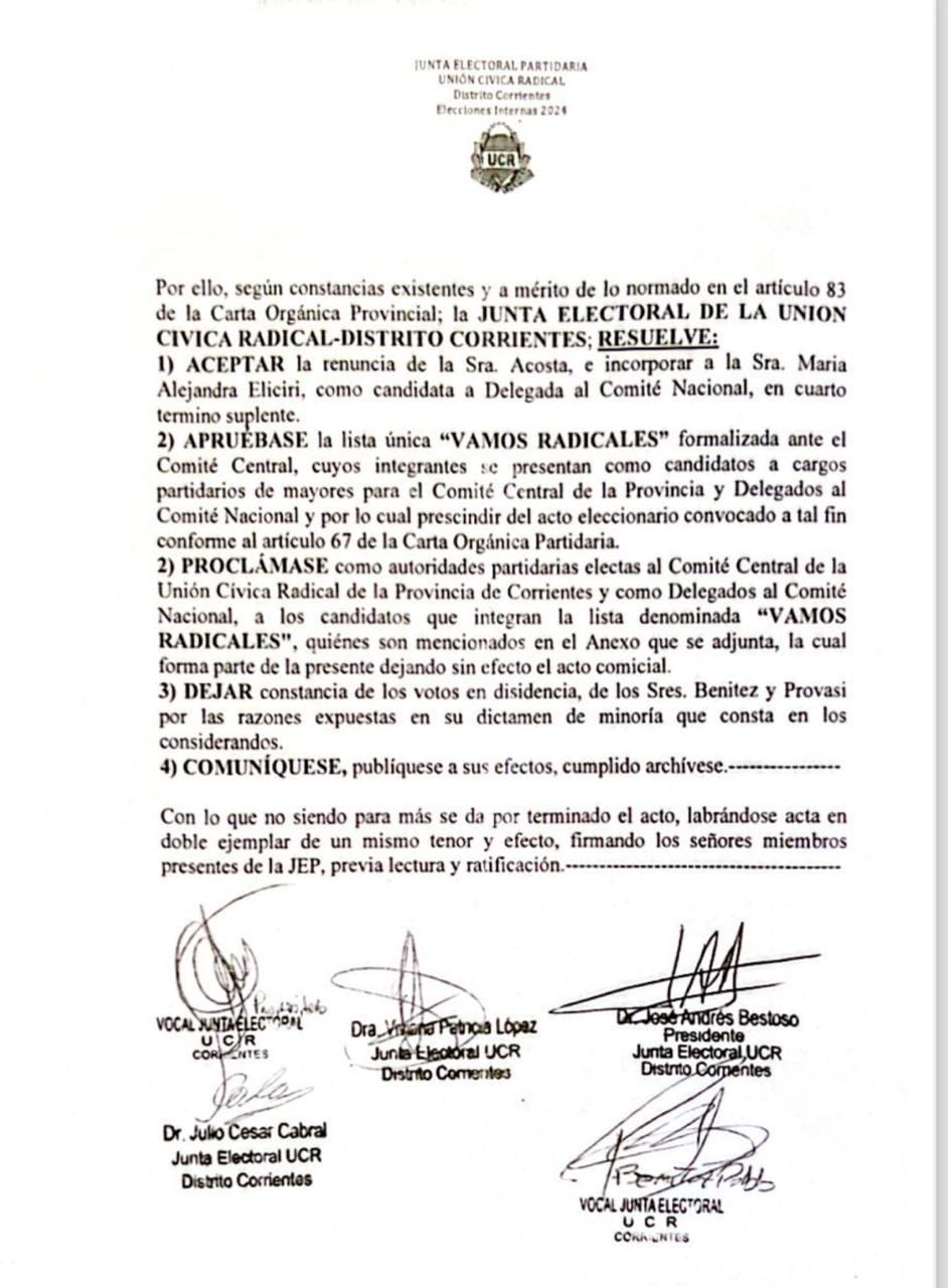 La Junta Electoral de la Unión Cívica Radical (UCR) de Corrientes dio a conocer hoy el acta N°5/2024, por el cual proclama a la lista (única) encabezada por el gobernador Gustavo Valdés como ganadora de las elecciones del 27 de octubre y, de ahora en más, conductora del Consejo Provincial del partido.