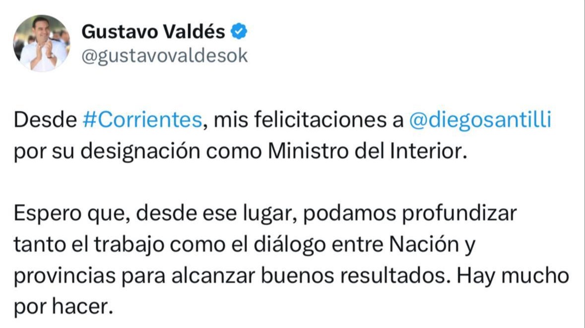 Tras conocerse ayer la designación, por parte del presidente de la Nación, Javier MIlei, de Diego Santilli como nuevo ministro del Interior, el gobernador de Corrientes, Gustavo Valdés, expresó su beneplácito por ello y que, a partir de este cambio, “podamos profundizar” el diálogo entre Nación y provincias “para alcanzar buenos resultados”.