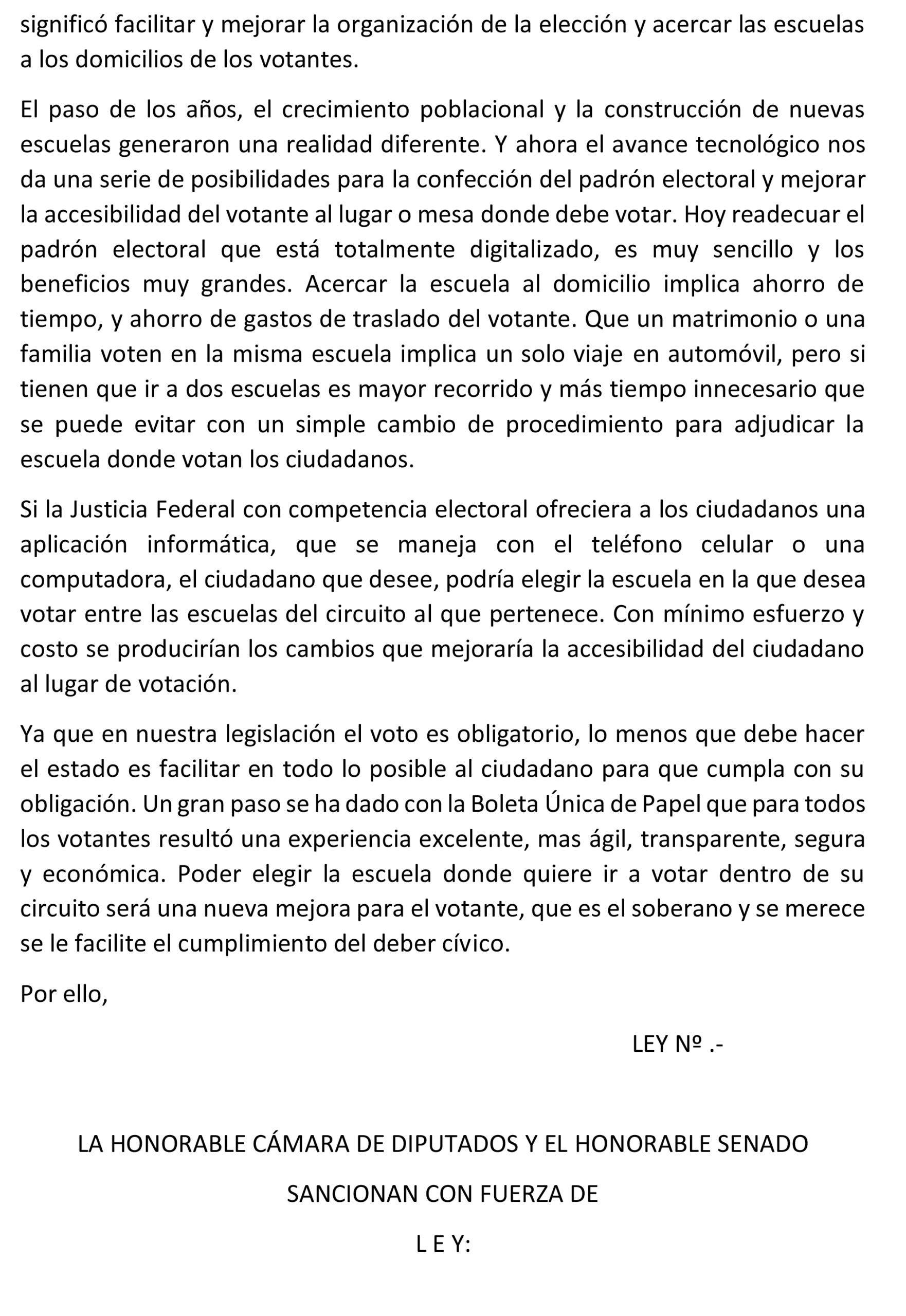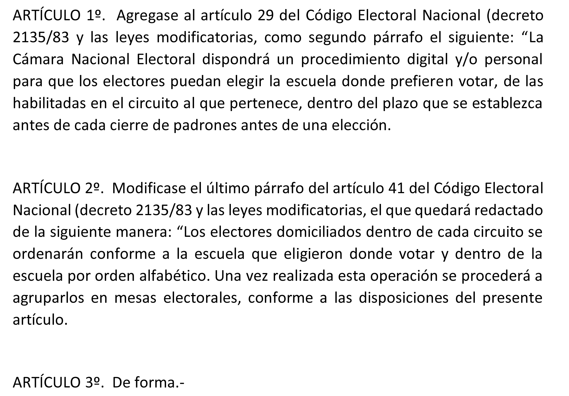 La iniciativa fue presentada en la Cámara de Diputados de la Nación y su objeto es lograr la modificación del Sistema de Asignación de Escuelas de Votación, de acuerdo con el domicilio del votante y el circuito al que pertenece.