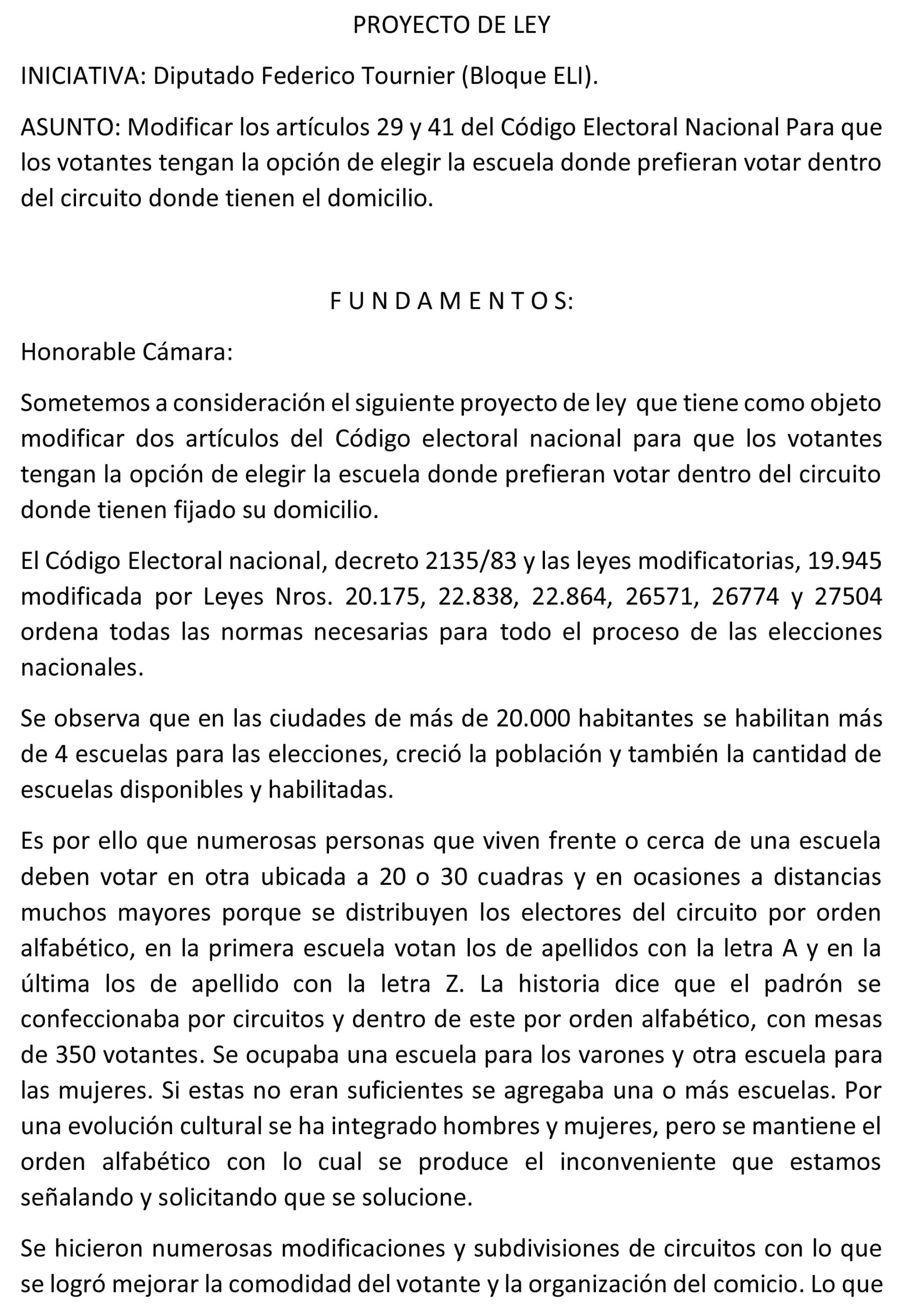La iniciativa fue presentada en la Cámara de Diputados de la Nación y su objeto es lograr la modificación del Sistema de Asignación de Escuelas de Votación, de acuerdo con el domicilio del votante y el circuito al que pertenece.