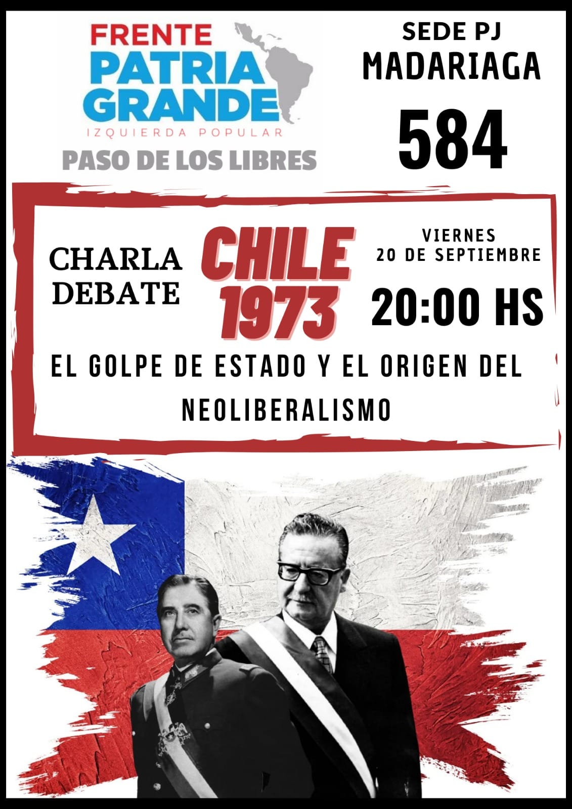 La charla-debate “Chile 1973. El golpe de Estado y el origen del neoliberalismo” tendrá lugar esta noche, a propuesta del Frente Patria Grande de Paso de los Libres en la idea de conocer en profundidad la génesis neoliberal en Latinoamérica, que comenzó con el derrocamiento del socialista chileno Salvador Allende por parte del general Augusto Pinochet; como primer acto de la implementación del Plan Cóndor y la instauración de dictaduras militares en la mayoría de los países del continente.