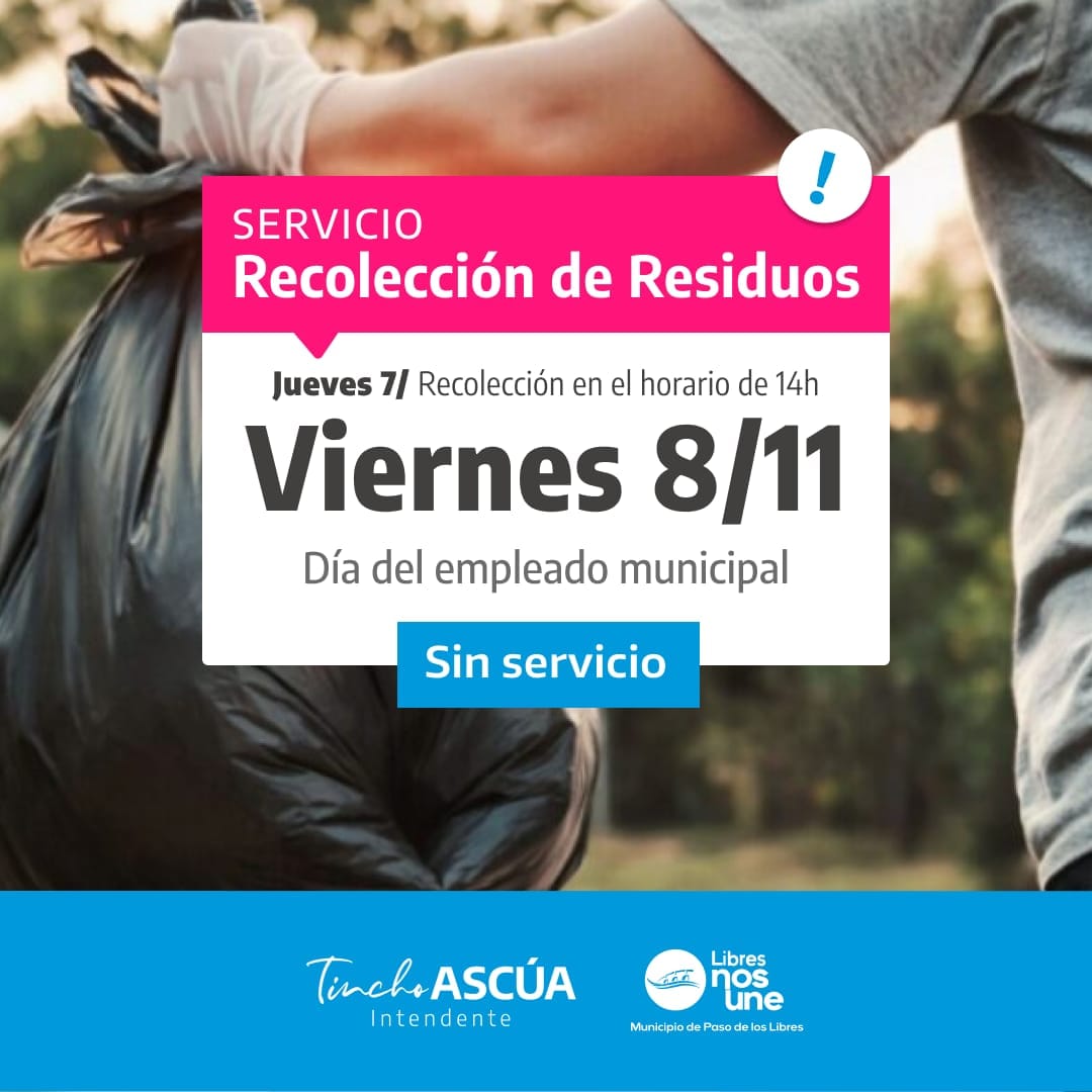 Desde la Dirección de Servicios Públicos del Municipio de Paso de los Libres se dio a conocer los cambios en el servicio de recolección de residuos con motivo del Día del Empleado Municipal, que se celebrará mañana, viernes 8 de noviembre.