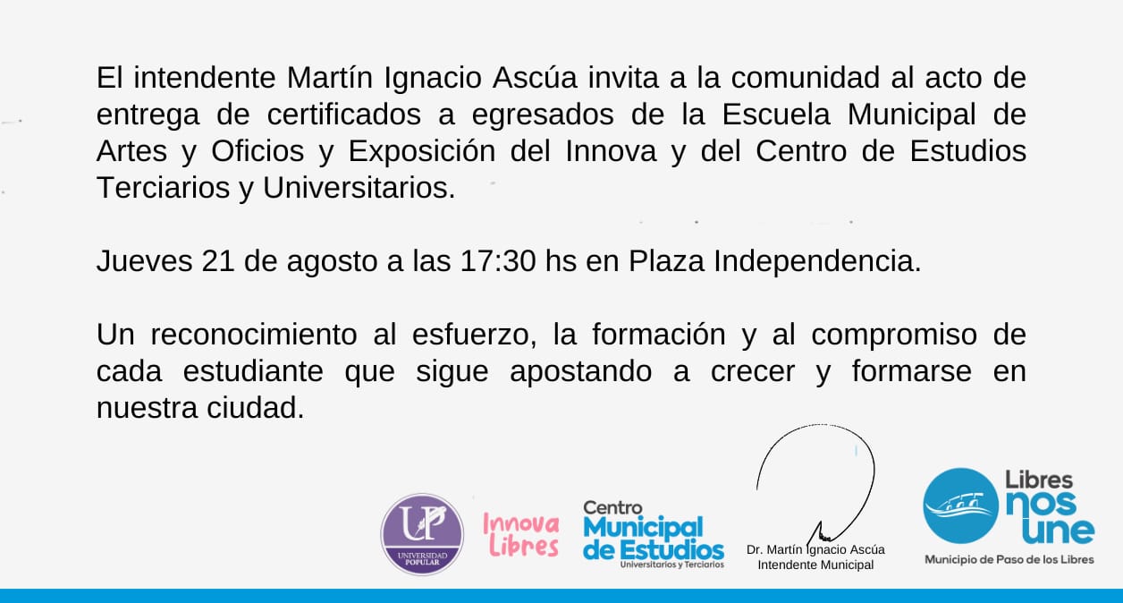Esta tarde, a las 17,30 horas, tendrá lugar en la plaza Independencia el acto de entrega de certificados a los egresados de la Escuela Municipal de Artes y Oficios, coordinada desde el Gobierno comunal de Paso de los Libres.