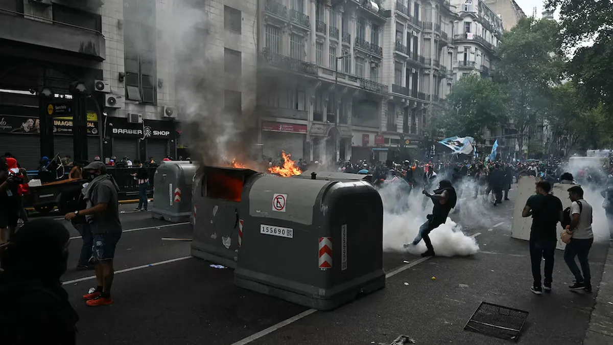 Rompieron baldosas para usarlas como proyectiles y quemaron tachos y contenedores de basura, además de romper autos y robar y atacar negocios. Sobre Avenida Callao y Presidente Perón formaron una barricada de contenedores incendiados.