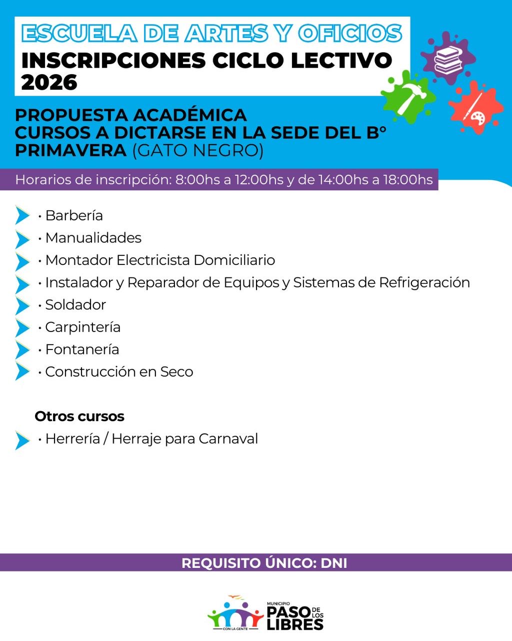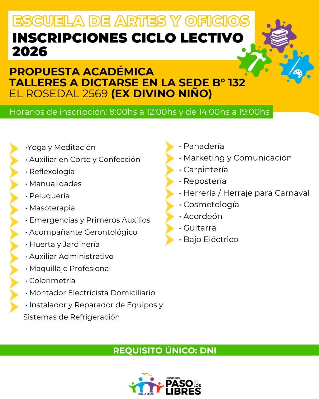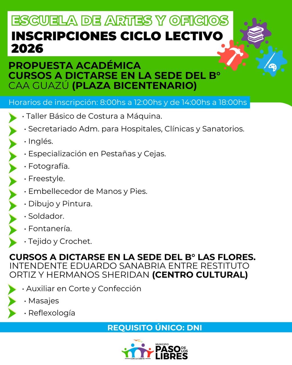 Se encuentran abiertas las inscripciones para los distintos talleres culturales de la Escuela de Artes y Oficios de la Municipalidad de Paso de los Libres, ampliando este año la cantidad de propuestas y sumando, además, una nueva sede en el barrio “Primavera”.