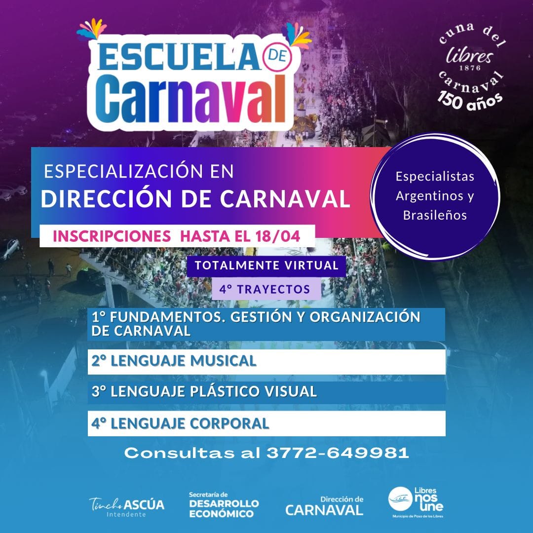 Se encuentra abierta la inscripción para la Especialización en Dirección de Carnaval, una propuesta totalmente virtual de la Dirección de Carnaval de la Municipalidad de Paso de los Libres destinada a fortalecer la formación de quienes integran el universo del carnaval.