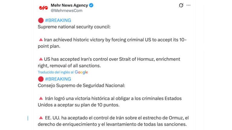 Lejos de presentar la tregua como una concesión, el régimen iraní intentó encuadrarla como un triunfo político. Según esa versión, Washington terminó aceptando un petitorio de diez puntos impulsado por Teherán, que incluye el levantamiento de sanciones y el reconocimiento de su programa nuclear.