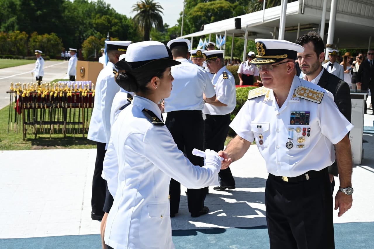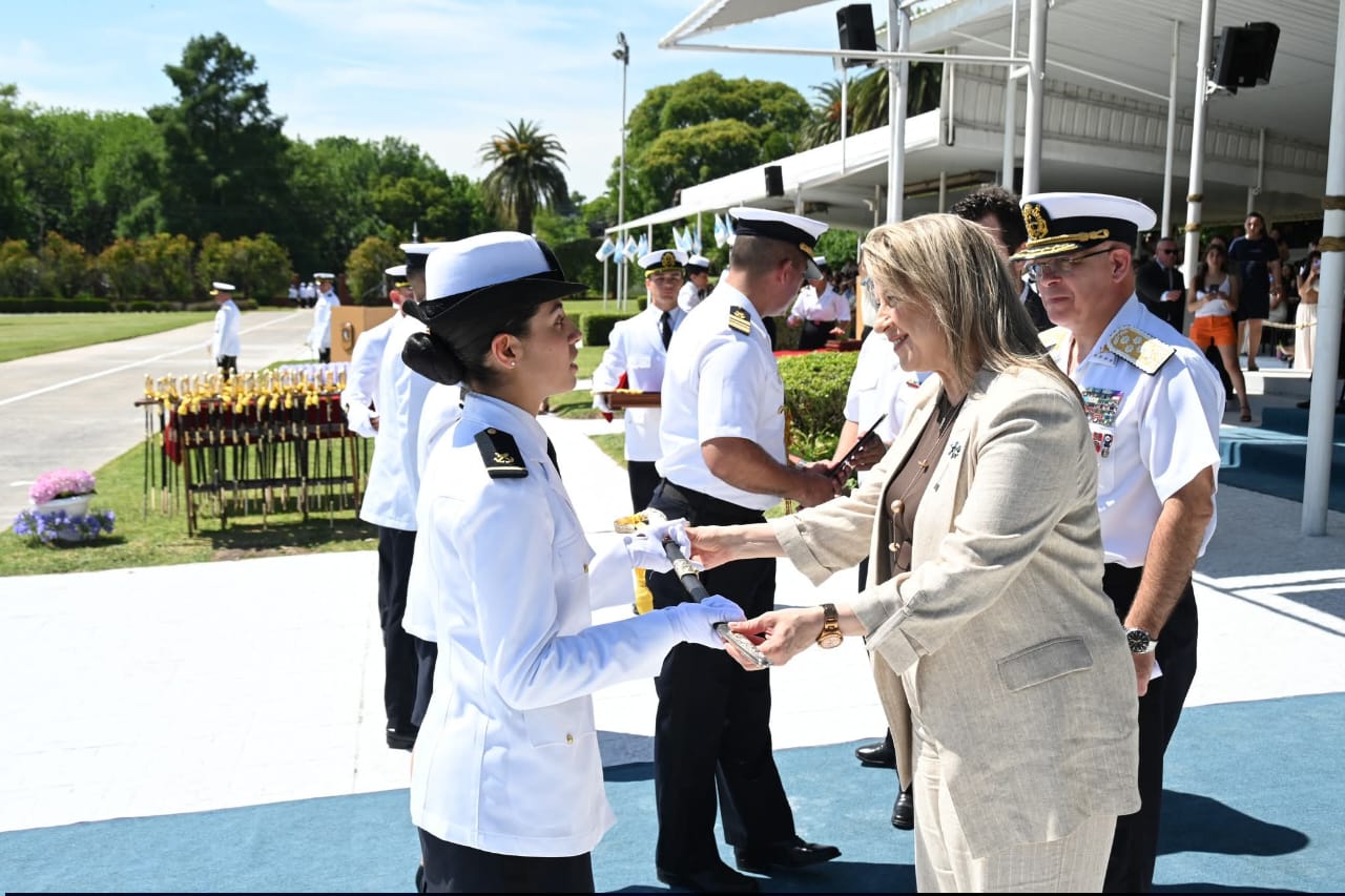 El acto de egresada, con todos los honores, se realizó en la Escuela de Oficiales de la Prefectura Naval Argentina en Zárate, provincia de Buenos Aires, a fines de 2025.