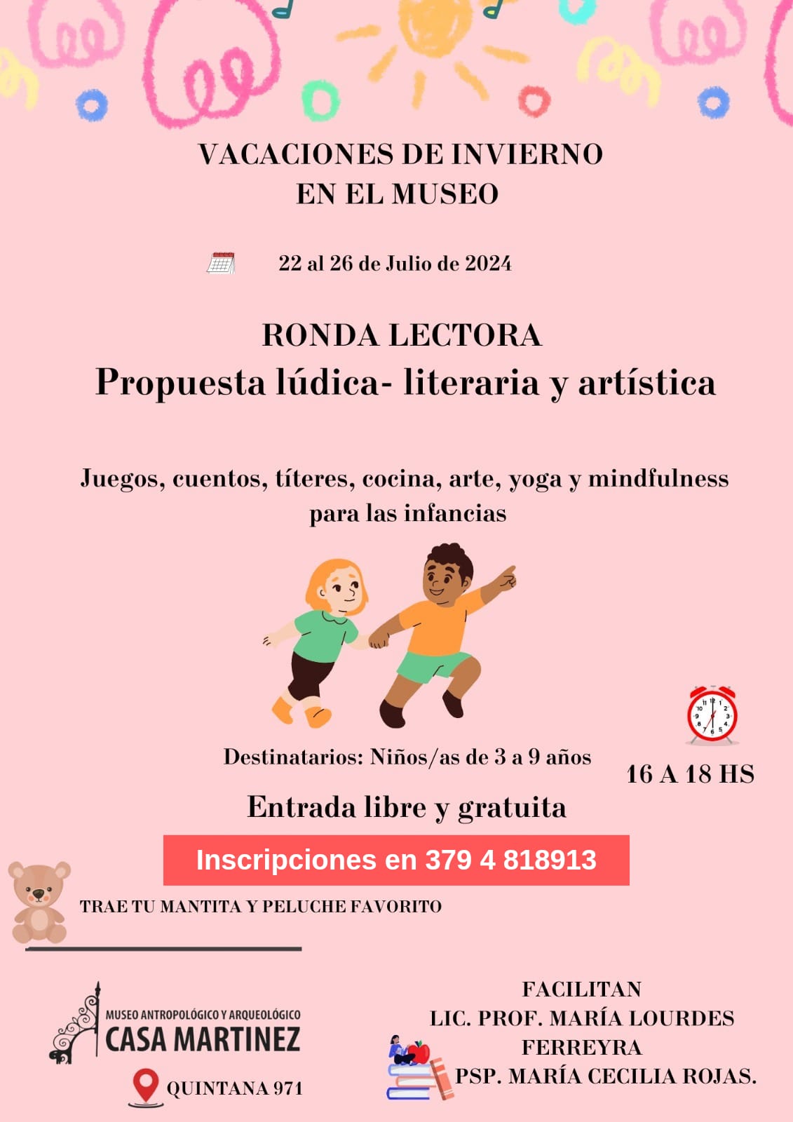Las entradas son libres y gratuitas, pero deben inscribirse al siguiente contacto: 3794 818913. Facilitan la licenciada profesora María Lourdes Ferreyra y psicopedagoga María Cecilia Rojas.