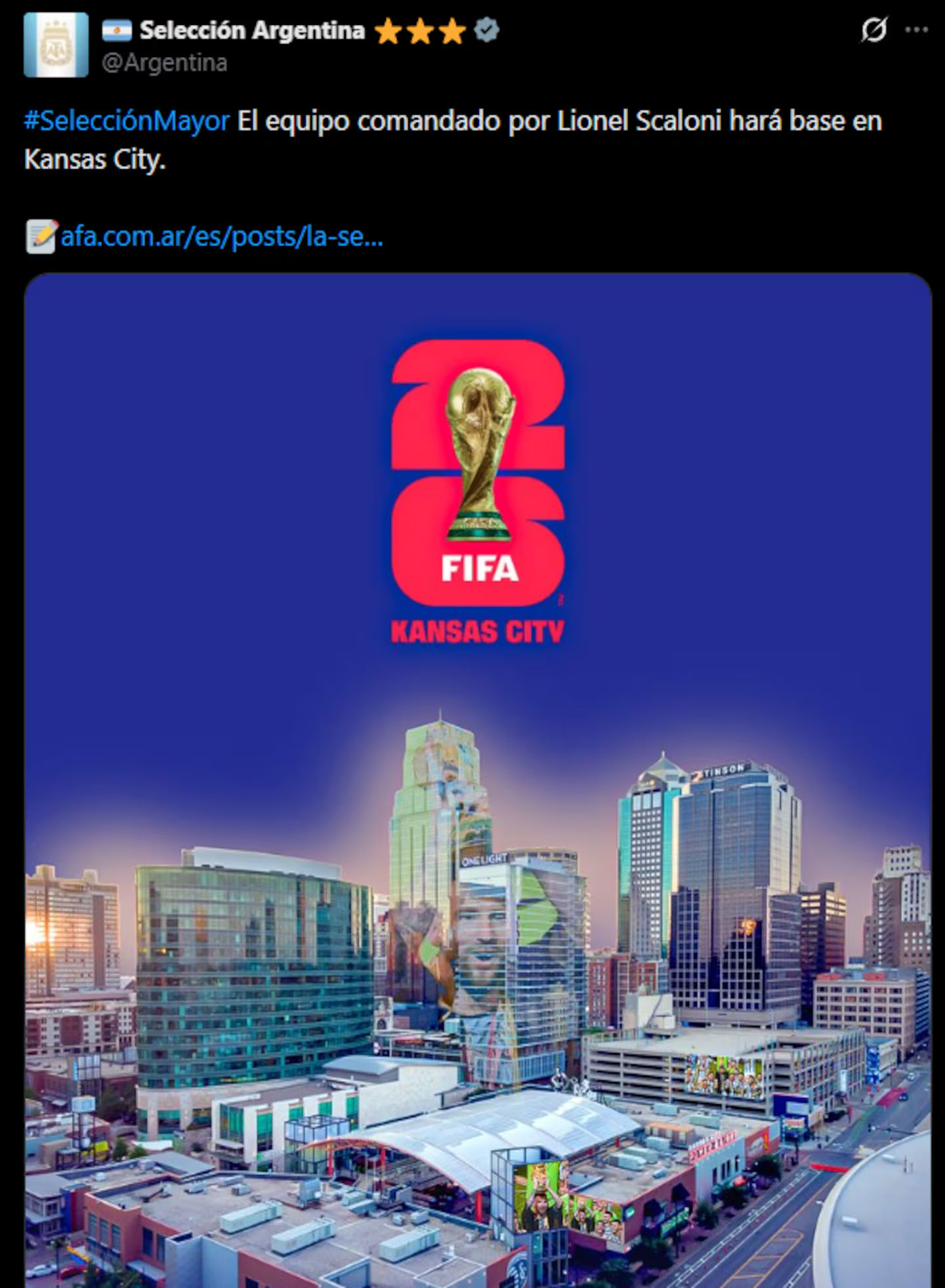 “De cara a la próxima Copa del Mundo de la FIFA 2026, la Selección Argentina que comanda Lionel Scaloni, tendrá como base, durante gran parte de la competencia, a la ciudad de Kansas”, escribieron en un comunicado oficial desde la Albiceleste.
