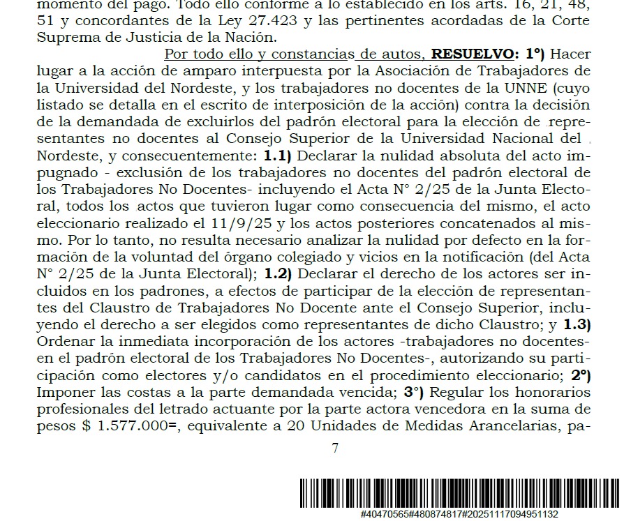 En su parte resolutiva, el fallo establece textualmente: “Hacer lugar a la acción de amparo interpuesta por la Asociación de Trabajadores de la Universidad del Nordeste, y los trabajadores no docentes de la UNNE (cuyo listado se detalla en el escrito de interposición de la acción) contra la decisión de la demandada de excluirlos del padrón electoral para la elección de representantes no docentes al Consejo Superior de la Universidad Nacional del Nordeste, y consecuentemente: 1.1) Declarar la nulidad absoluta del acto impugnado – exclusión de los trabajadores no docentes del padrón electoral de los Trabajadores No Docentes- incluyendo el Acta N° 2/25 de la Junta Electoral, todos los actos que tuvieron lugar como consecuencia del mismo, el acto eleccionario realizado el 11/9/25 y los actos posteriores concatenados al mismo”.