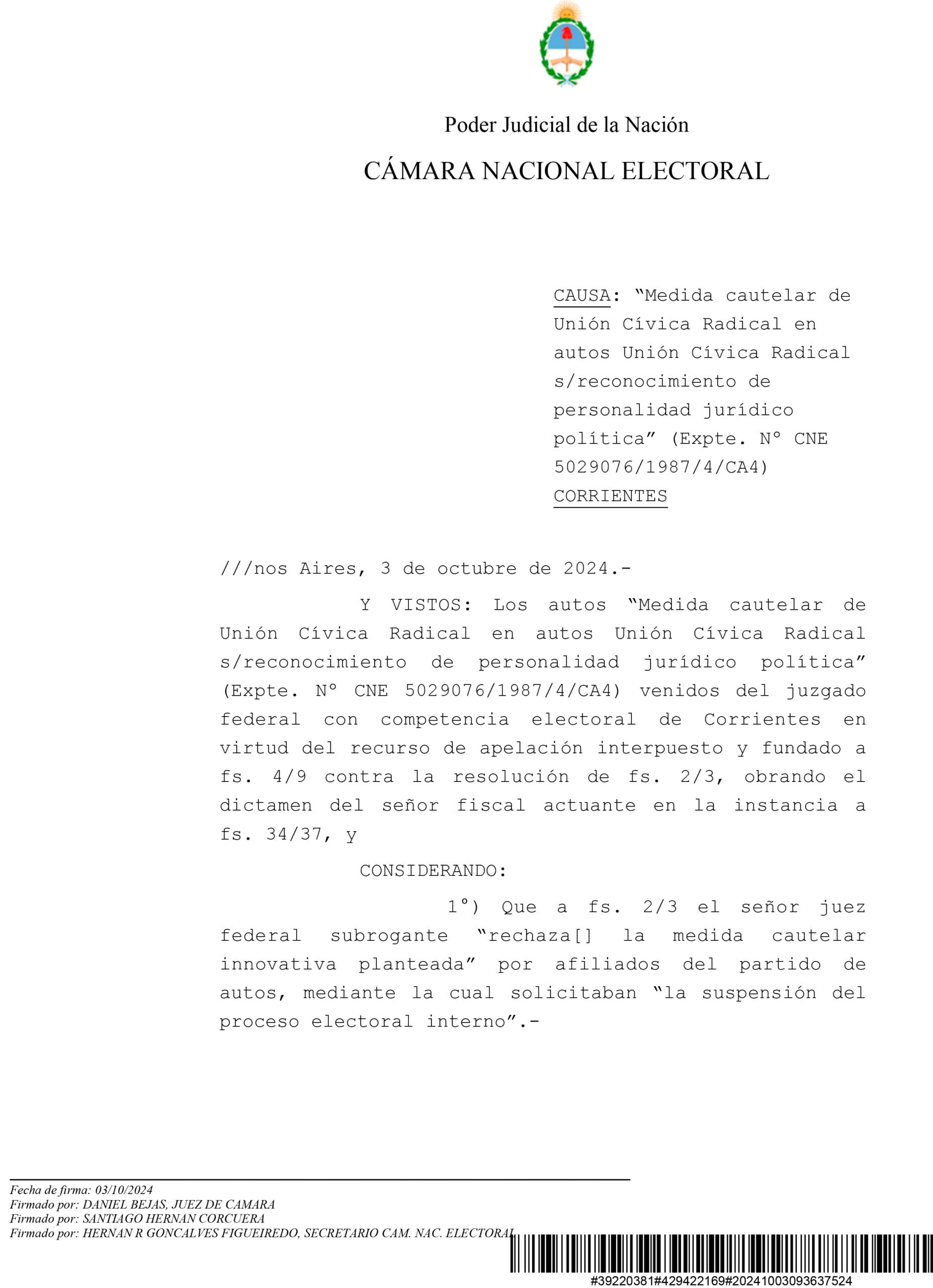 La medida cautelar había sido solicitada inicialmente ante el Juzgado Federal con competencia electoral de Corrientes, el cual días atrás había ya rechazado el pedido. Ante esto, los peticionantes apelaron ante la Cámara Nacional Electoral, la que en el día de hoy confirmó el fallo de primera instancia, sepultando la pretensión de evitar las elecciones internas en el ucerreísmo correntino.