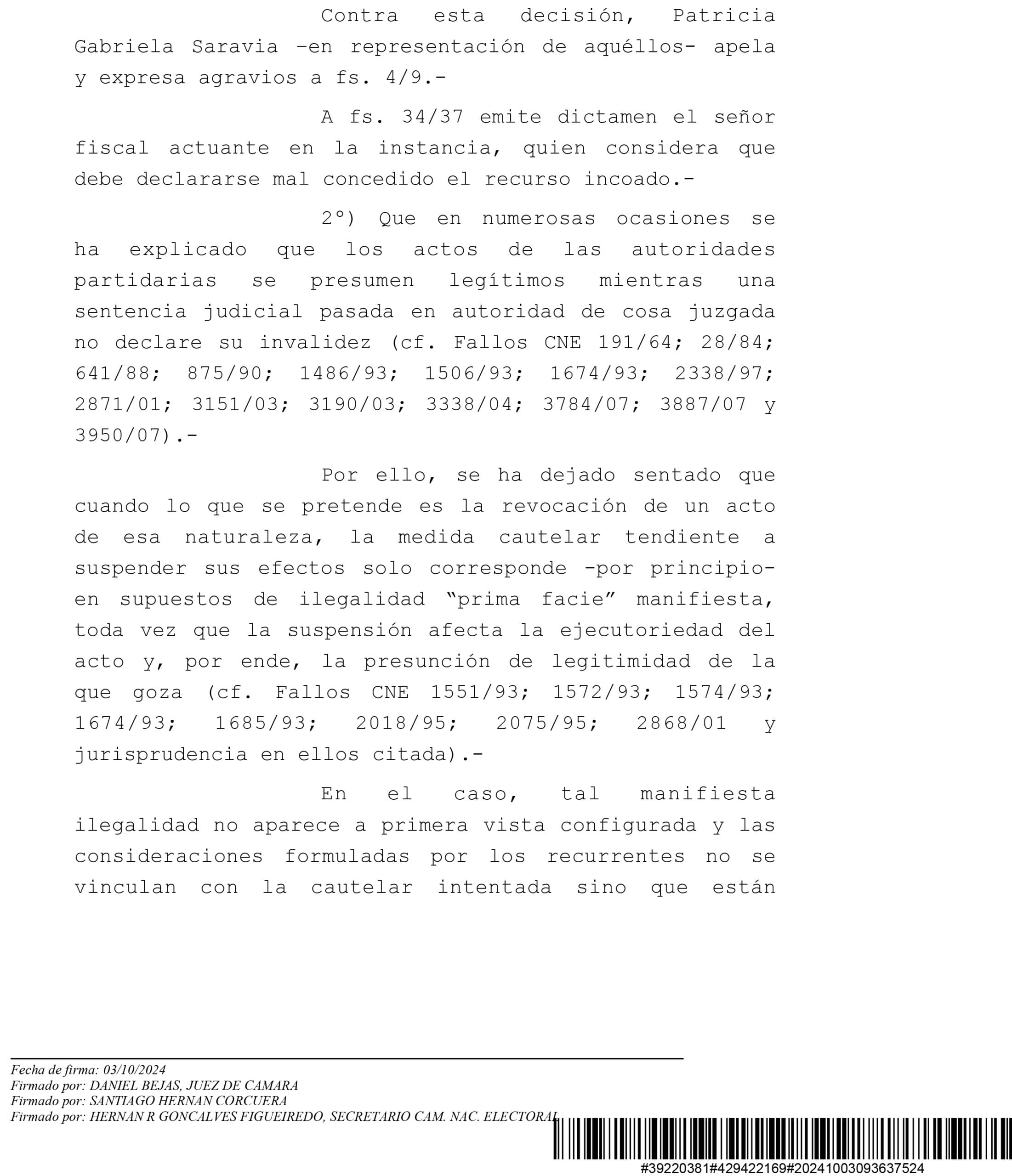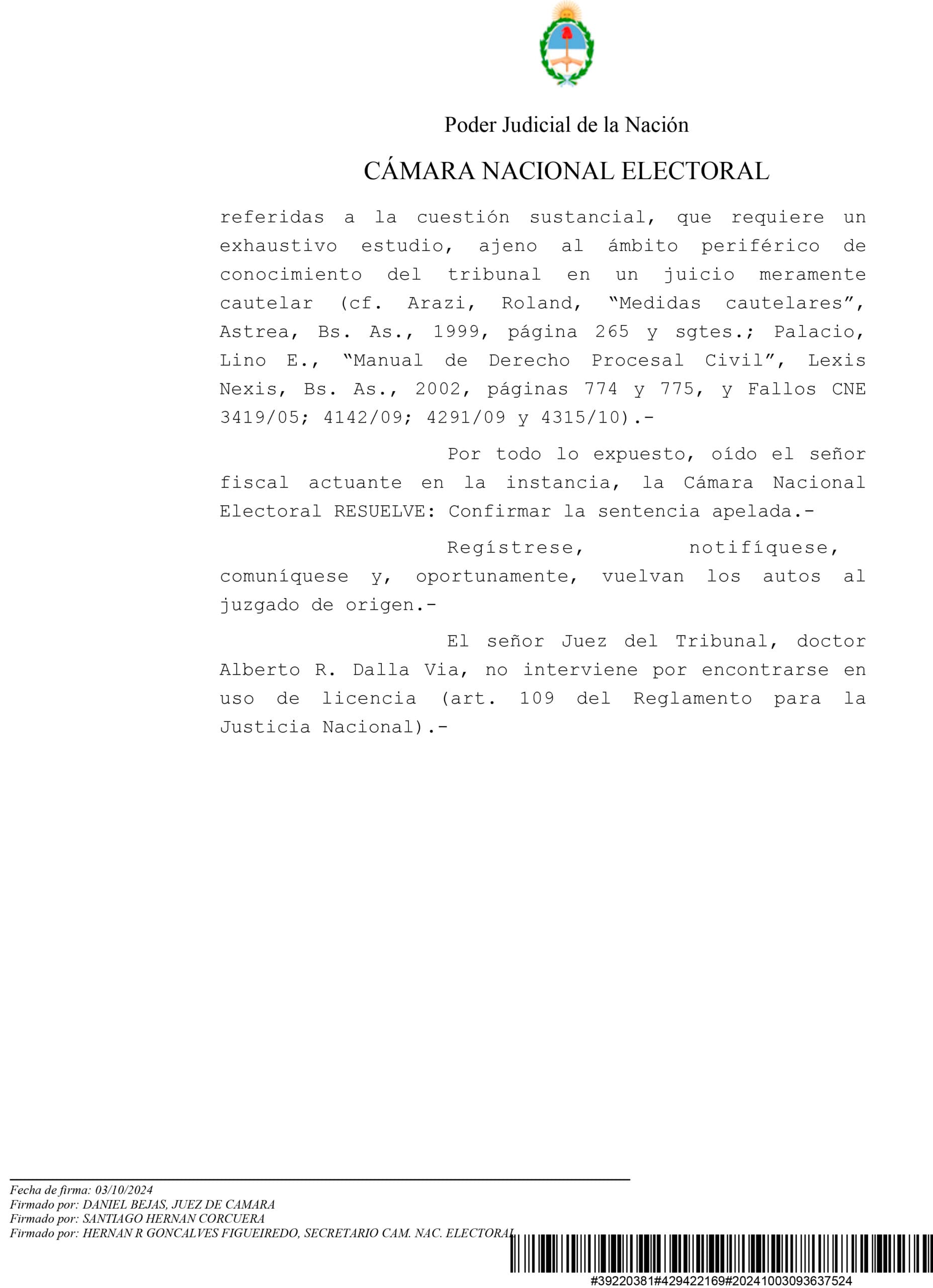 En horas de la mañana el Juzgado Federal con competencia electoral había ya resuelto sobre el fondo de la cuestión en el mismo sentido y rechazando la solicitud de declarar la nulidad del proceso interno.