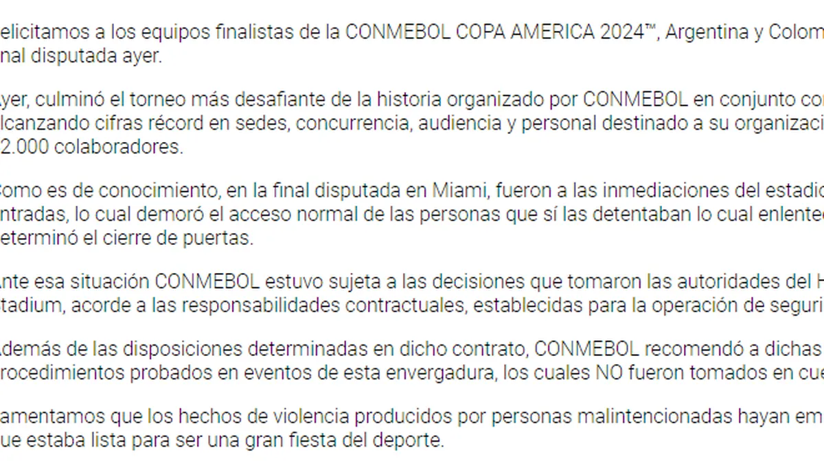 Asimismo, añadieron: “Ante esa situación, Conmebol estuvo sujeta a las decisiones que tomaron las autoridades del Hard Rock Stadium, de acuerdo con las responsabilidades contractuales establecidas para la operación de seguridad”.