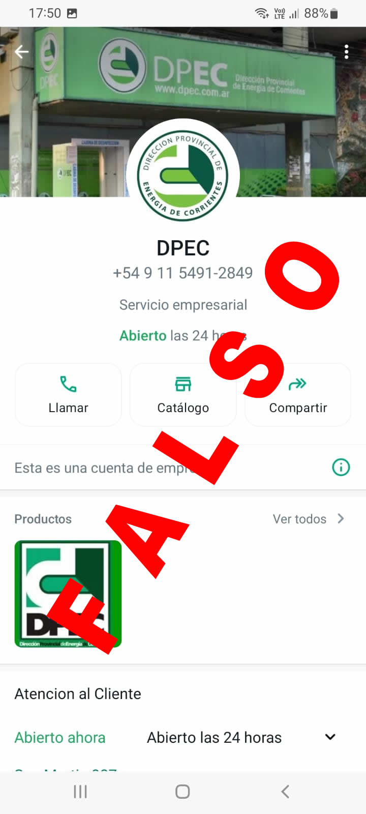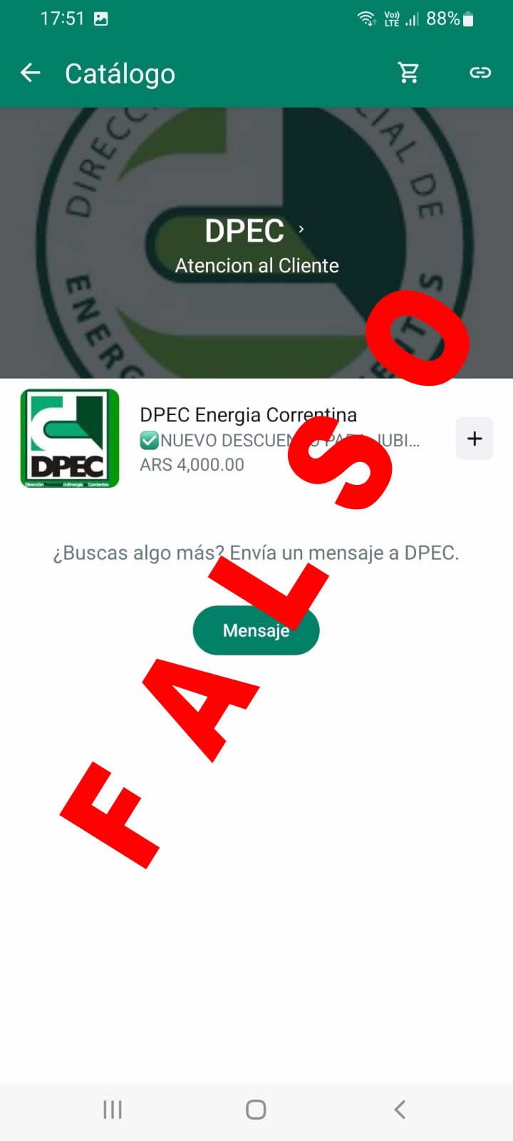 La Dirección Provincial de Energía de Corrientes (DPEC) dio cuenta de la falsedad de una propuesta de descuento para jubilados que circula por medio de WhatsApp.
