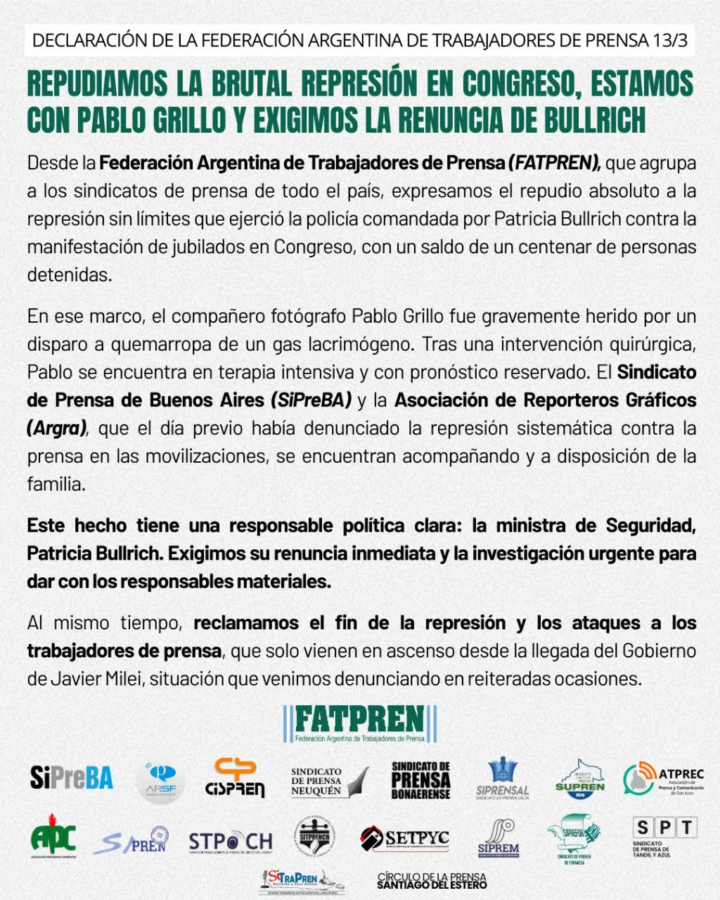 Desde la Federación Argentina de Trabajadores de Prensa (FATPREN), que agrupa a los sindicatos de prensa de todo el país, expresaron “el repudio absoluto a la represión sin límites que ejerció la policía comandada por Patricia Bullrich contra la manifestación de jubilados en Congreso, con un saldo de un centenar de personas detenidas.