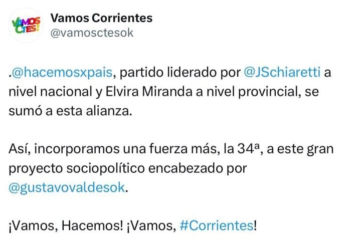 El frente gobernante Vamos Corrientes (VC) hizo saber hoy de la incorporación del partido Hacemos por Nuestro País, cuyo presidente es Juan Schiaretti y vicepresidente Florencio Randazzo, teniendo como referente provincial a Elvira Miranda.