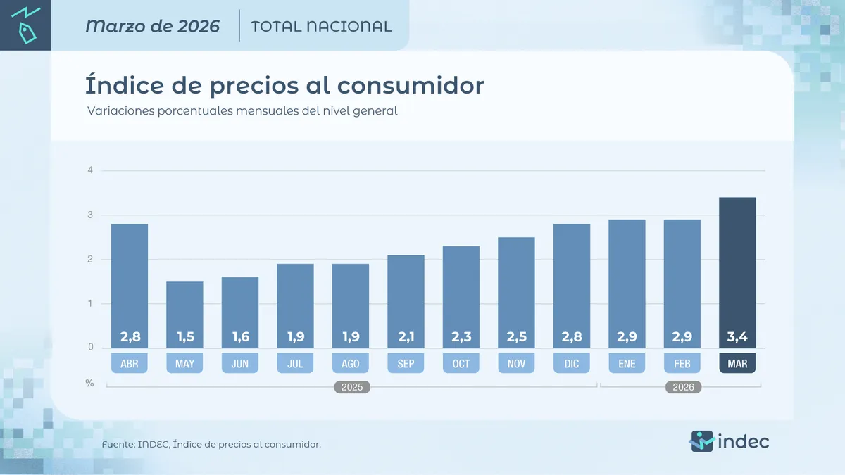El Índice de Precios al Consumidor (IPC) de marzo marcó 3,4% respecto a febrero y en el primer trimestre alcanzó un 9,4%, indicó esta tarde el Instituto Nacional de Estadística y Censos (INDEC).