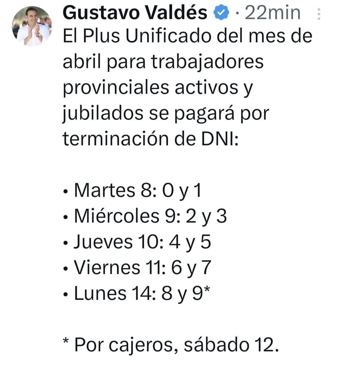 A través de sus redes sociales, @gustavovaldesok, el gobernador de Corrientes, Gustavo Valdés, adelantó que el pago del Adicional Remunerativo Mensual (Plus Unificado) correspondiente a abril – de $55 mil por agente activos, jubilados y pensionados- se realizará entre este martes 8 y el lunes 14 próximo.