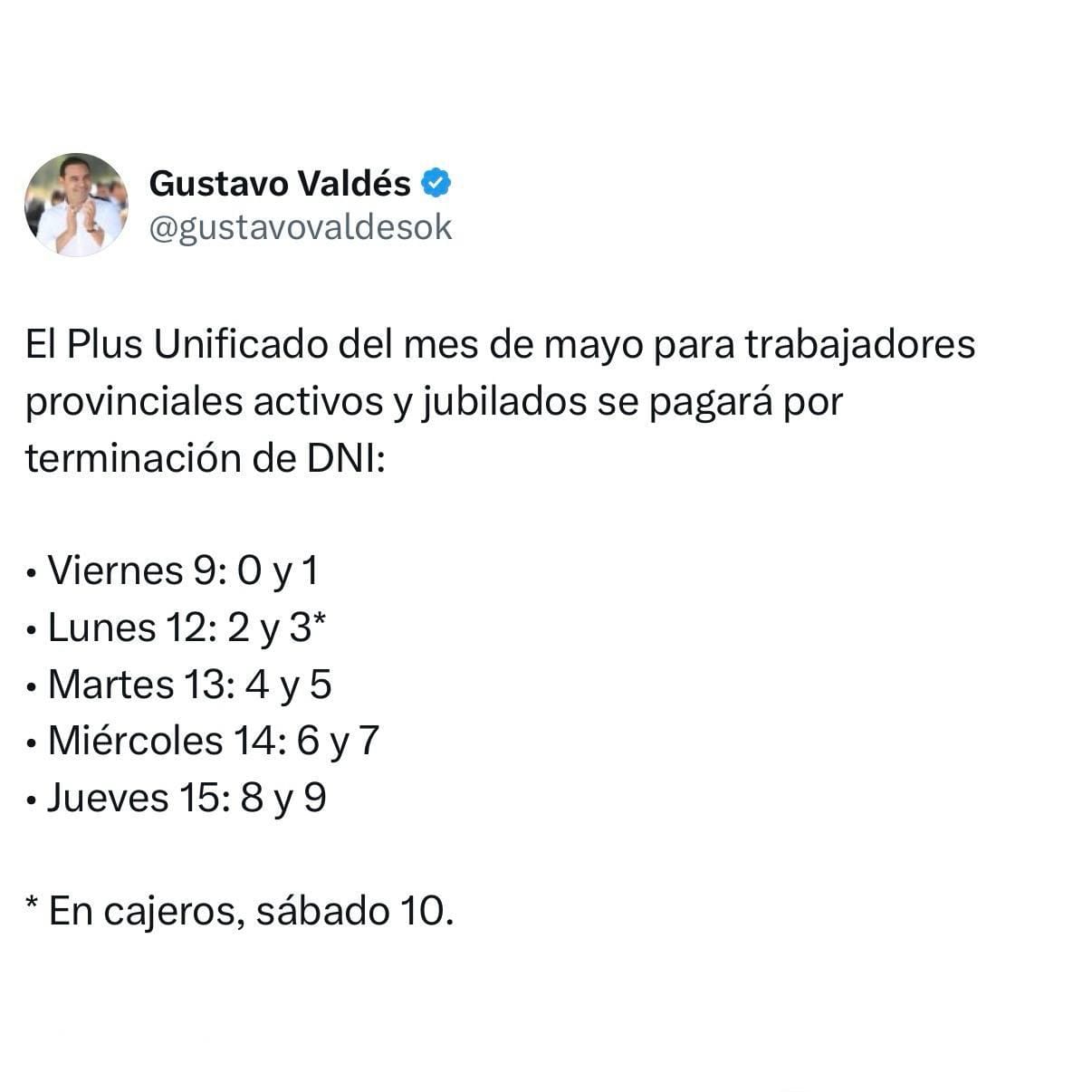 A través de sus cuentas en redes sociales (@gustavovaldesok), el gobernador de Corrientes, Gustavo Valdés, dio cuenta del cronograma de pago del Adicional Remunerativo Mensual de mayo (Plus Unificado) de $55.000 por agente de la Administración Pública provincial, tanto activos, jubilados y pensionados.