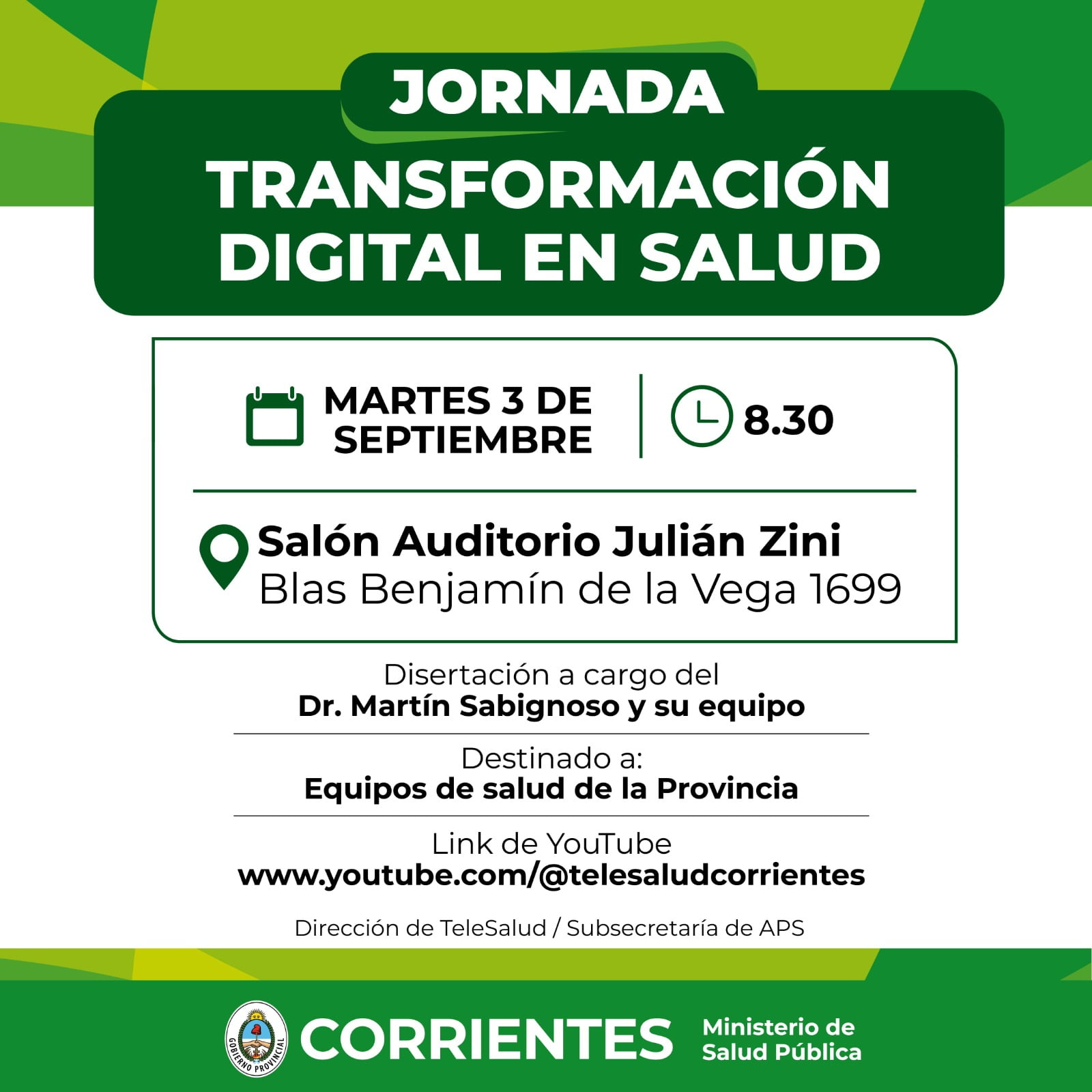 Organizada por el Ministerio de Salud Pública, a través de la Dirección de Telesalud, se realizará mañana la Jornada “Transformación Digital del Sistema de Salud de Corrientes”. La disertación estará a cargo de especialistas de la F1dación Estudios e Investigaciones Administrativas en Salud (Feias). Se llevará adelante a partir de las 8.30 en el Auditorio Julián Zini ubicado por Blas Benjamín de la Vega 1699.
