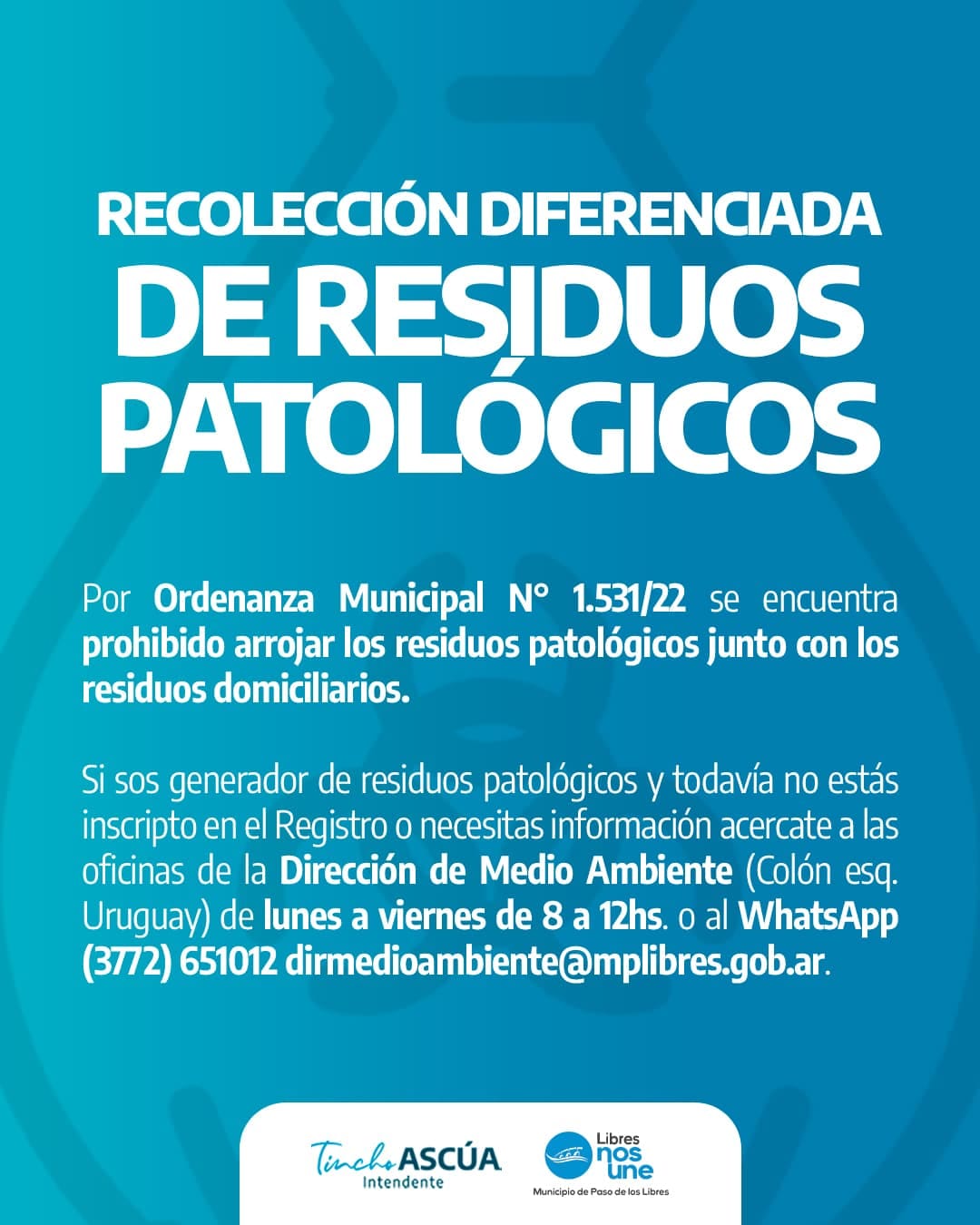 La Municipalidad de Paso de los Libres recuerda que, según lo establecido por la Ordenanza Municipal Nº1.531/22, está prohibido arrojar residuos patológicos junto con los residuos domiciliarios, debiendo realizarse una disposición diferenciada para este tipo de desechos.