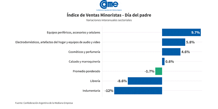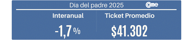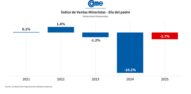 El Índice de Ventas Minoristas para el Día del Padre elaborado por la Confederación Argentina de la Mediana Empresa (CAME) registró por tercer año consecutivo una variación interanual negativa, reflejando una tendencia sostenida de debilidad en el consumo vinculado a esta celebración.