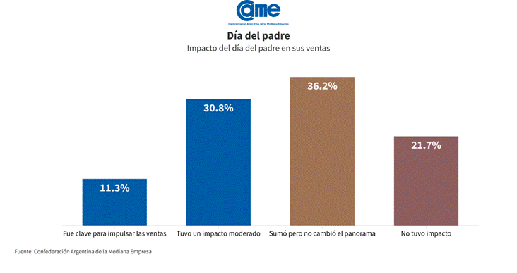 En cuanto a la percepción de los comerciantes, el 58% de los encuestados señaló que el Día del Padre no tuvo impacto o, si bien sumó algo de movimiento, no modificó la realidad comercial del mes. Sólo un 11,3% afirmó que la fecha fue clave para impulsar las ventas, como se detalla en el gráfico “Impacto del Día del Padre en sus ventas”.