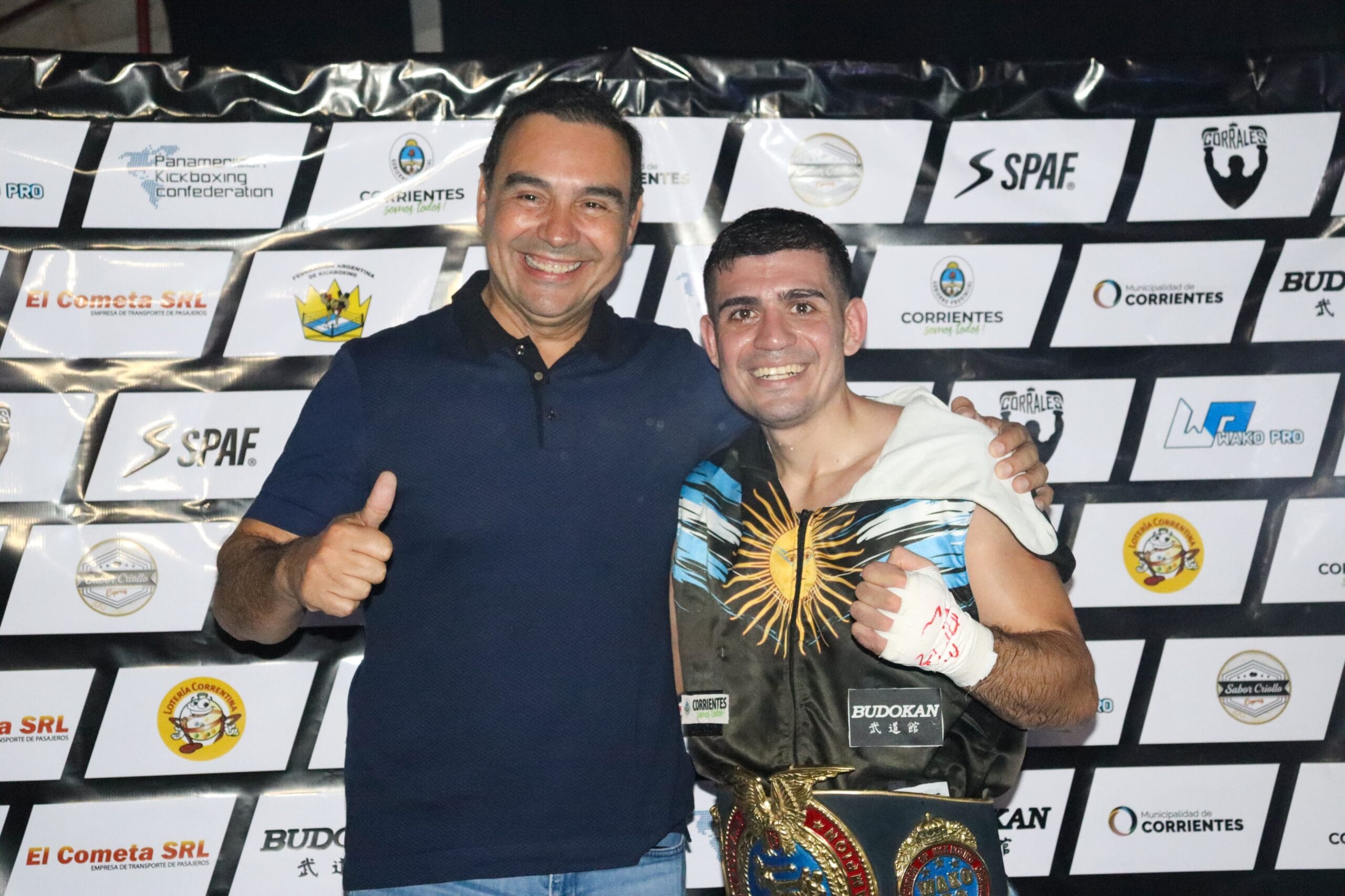 Así fue que el correntino es el nuevo campeón Wako Pro de la modalidad Low Kick (-60 kg) y el respectivo cinturón se lo entregó en la ocasión el gobernador Gustavo Valdés, quien participó al espectáculo.