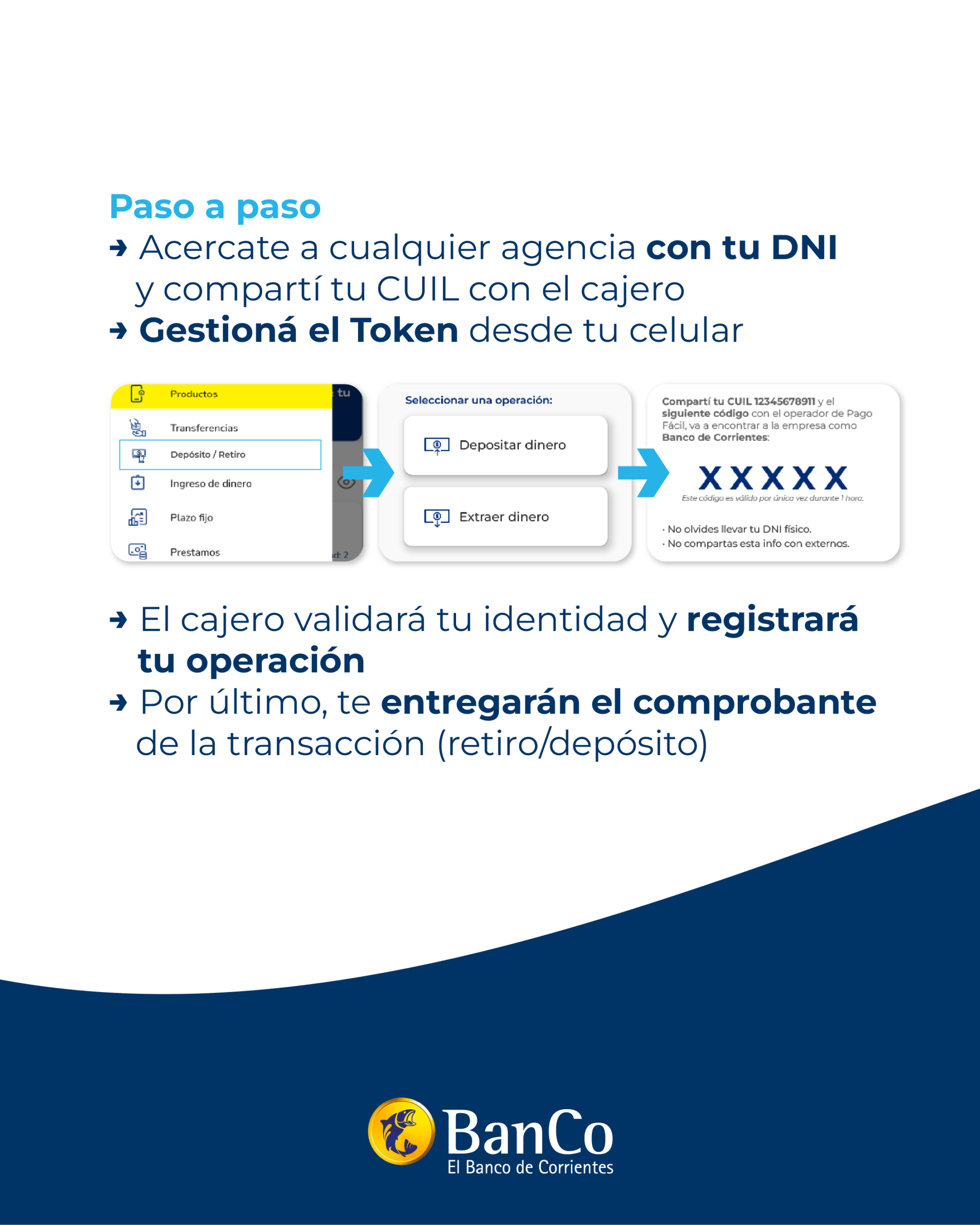 Para operar, el cliente debe concurrir a una agencia de Pago Fácil con su DNI, informar su número de CUIL y el monto a retirar o depositar, y generar el token (código de seguridad) desde la aplicación MÁSBanCo. El cajero validará la identidad, registrará la operación y entregará el comprobante correspondiente.