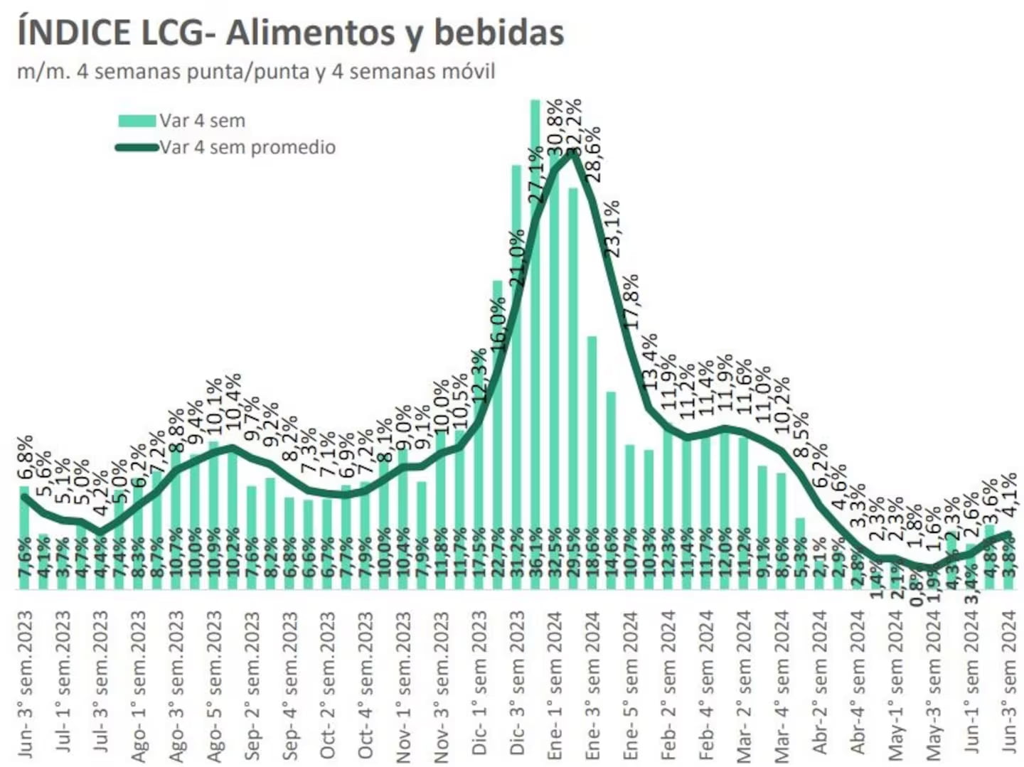 En lo que va de 2024, en cambio, el rubro alimentos acumuló un alza de 65,6% frente al 71,9% de la inflación general. Esa relación vuelve a invertirse al mirar los últimos 12 meses, ya que a lo largo de ese período los alimentos escalaron 289,4% y el índice de precios al consumidor aumentó 276,4%.