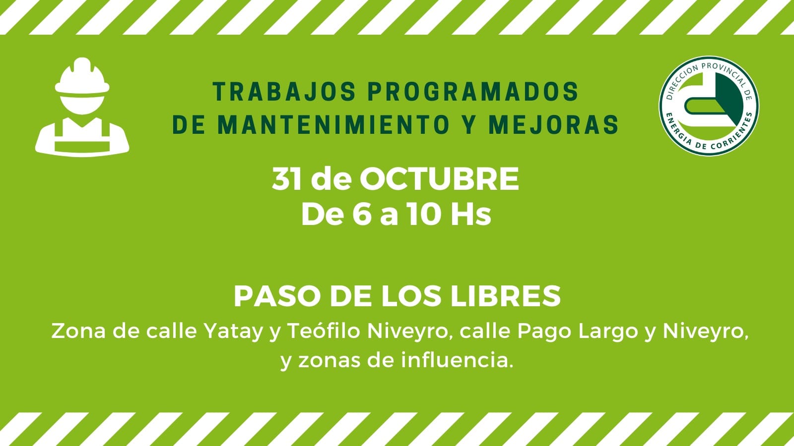 Con motivo de realizar mejoras en el servicio, operarios de la Dirección Provincial de Energía de Corrientes (DPEC) ejecutarán mañana (jueves 31/10) tareas de mantenimiento de Líneas de Baja Tensión (LBT) en Paso de los Libres, por lo que se interrumpirá el suministro de energía eléctrica en el horario de 6 a 10.