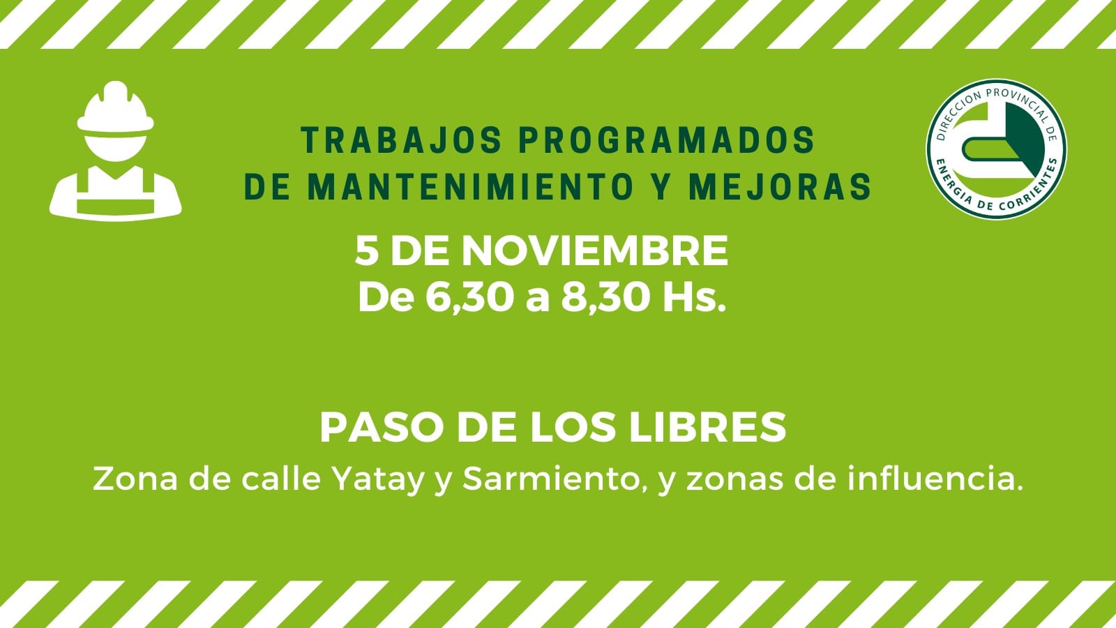 Con motivo de realizar mejoras en el servicio en Paso de los Libres, operarios de la Dirección Provincial de Energía de Corrientes (DPEC) ejecutarán hoy tareas de mantenimiento de Líneas de Media Tensión (LMT), por lo cual se interrumpirá el suministro de energía eléctrica en el horario de 6,30 a 8,30.