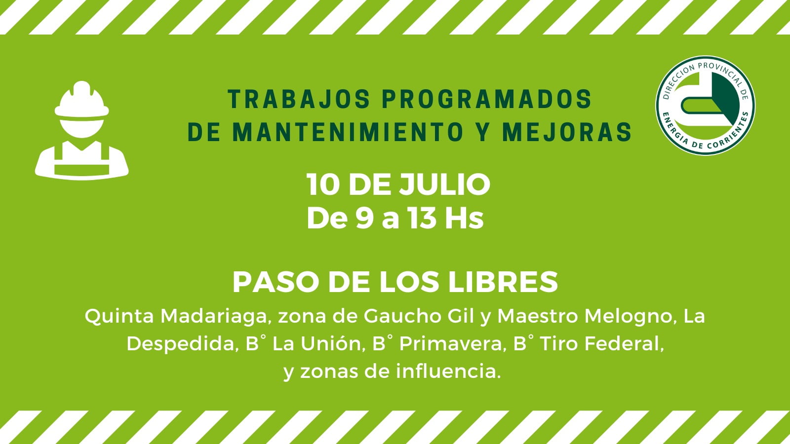 Por esa razón, se interrumpirá el suministro de energía eléctrica en el horario de 9 a 13, en las zonas de la Quinta Madariaga, zona de Gaucho Gil y Maestro Melogno, “La Despedida”, barrios “La Unión”, “Primavera”, “Tiro Federal”, y zonas de influencia.