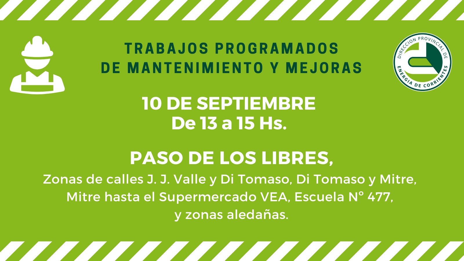 Operarios de la Dirección Provincial de Energía de Corrientes (DPEC) realizarán, el miércoles 10 de septiembre, cambio de aisladores de Media Tensión en la ciudad de Paso de los Libres, por lo cual se interrumpirá el suministro de energía eléctrica de 13 horas a 15 horas.