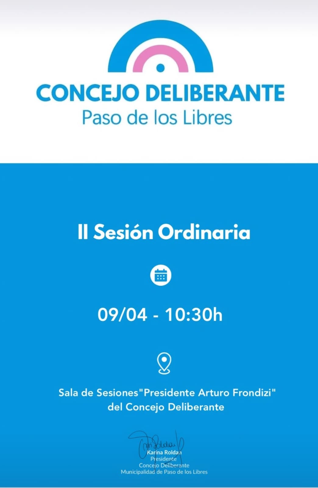 El Concejo Deliberante de Paso de los Libres celebrará mañana (miércoles 9 de abril) la segunda sesión ordinaria del período legislativo 2025, desde las 10,30 horas, en el recinto “Presidente Arturo Frondizi” y con la presidencia de Karina Roldán.