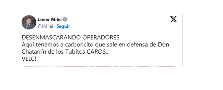 Minutos más tarde, apuntó directamente contra Rocca. “Desenmascarando operadores. Aquí tenemos a carboncito que sale en defensa de Don Chatarrín de los tubitos caros…”, expresó.