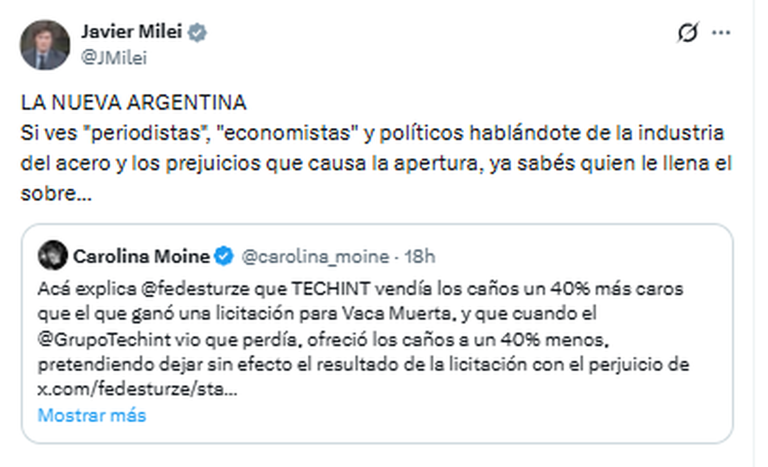 “La nueva Argentina. Si ves ‘periodistas’, ‘economistas’ y políticos hablándote de la industria del acero y los prejuicios que causa la apertura, ya sabés quién les llena el sobre”, escribió Milei en su cuenta de X.