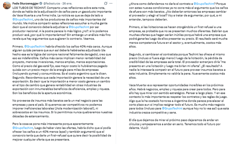 En un extenso posteo en la red social X, Sturzenegger cuestionó la idea de que la licitación debía resolverse en favor de la empresa local solo por tratarse de un productor nacional. “Me motiva compartir estas reflexiones [al] escuchar a mucha gente decir que el consorcio debería adjudicar a Grupo Techint por ser productor nacional.