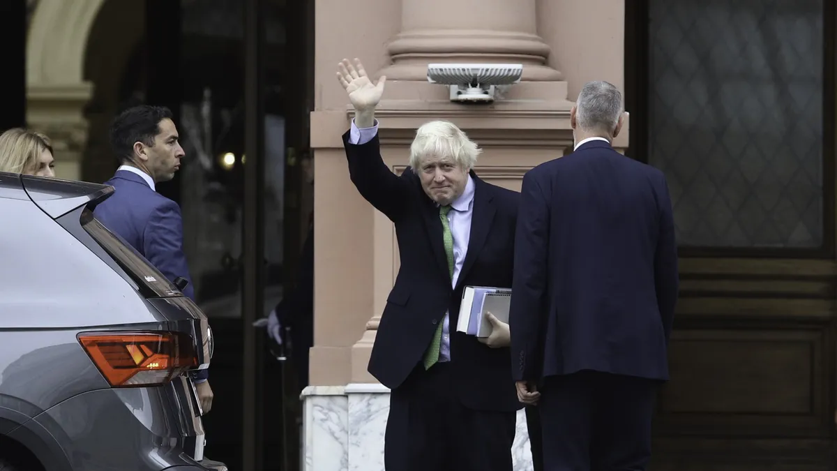 El encuentro entre Milei y Johnson se extendió por más de una hora y antes de retirarse de la sede gubernamental el dirigente inglés salió a saludar por uno de los balcones que dan a la Plaza de Mayo.