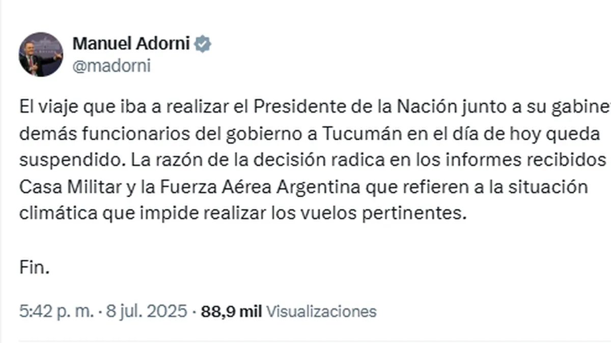 El parlante informó el cambio, a último momento, en la agenda presidencial con un mensaje en su cuenta de la red social X: “El viaje que iba a realizar el Presidente de la Nación junto a su gabinete y demás funcionarios del gobierno a Tucumán en el día de hoy queda suspendido”, publicó Adorni.