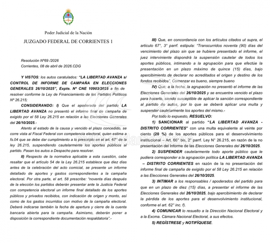 El Juzgado Federal N°1 de Corrientes sancionó al partido La Libertad Avanza (LLA) en el distrito provincial por no presentar el informe final de campaña correspondiente a las elecciones generales del 26 de octubre de 2025. La resolución fue firmada el pasado 8 de abril.