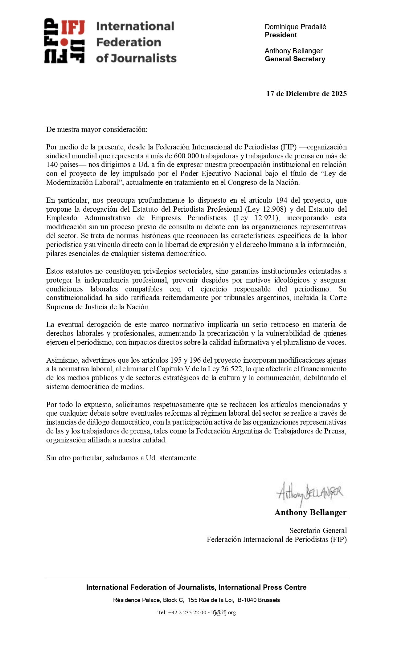 La Federación Internacional de Periodistas, a través de su secretario general, Anthony Bellanger, se dirigió mediante una carta a los senadores nacionales ante el tratamiento de la Ley de Reforma laboral que podría eliminar el Estatuto del Periodista.