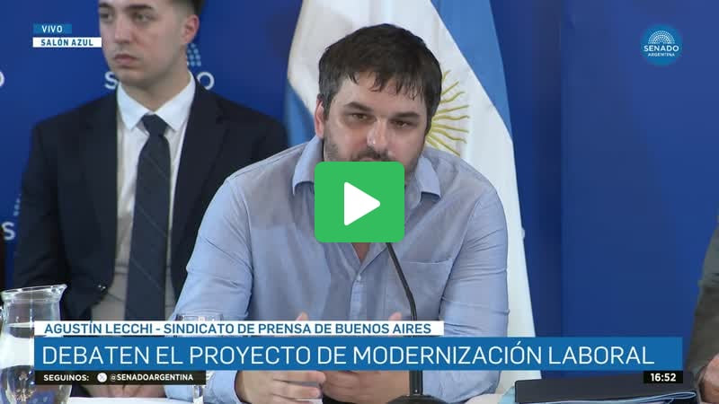 El secretario general del Sindicato de Prensa de Buenos Aires (SiPreBA) y dirigente de la Federación Argentina de Trabajadores (FATPren), Agustín Lecchi, llevó la voz de los trabajadores y las trabajadoras de prensa al Senado de la Nación, donde expresó nuestro rechazo al Proyecto del Gobierno nacional ante el plenario de las Comisiones de Trabajo y Presupuesto.
