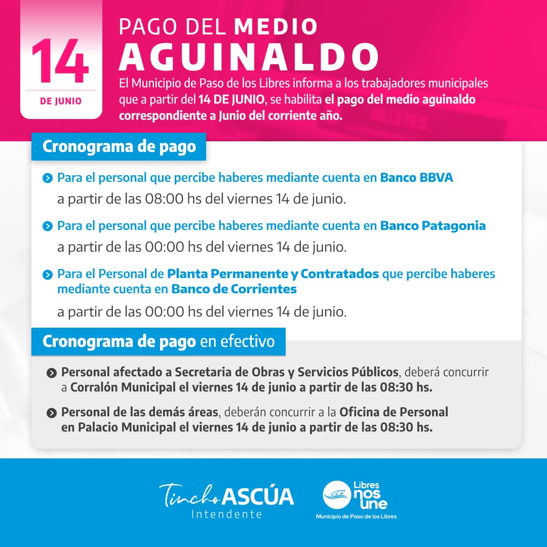 Los trabajadores del Municipio de Paso de los Libres cobrarán mañana (viernes 14/6) la primera cuota del Sueldo Anual Complementario (SAC) -medio aguinaldo- correspondiente a junio del corriente año.