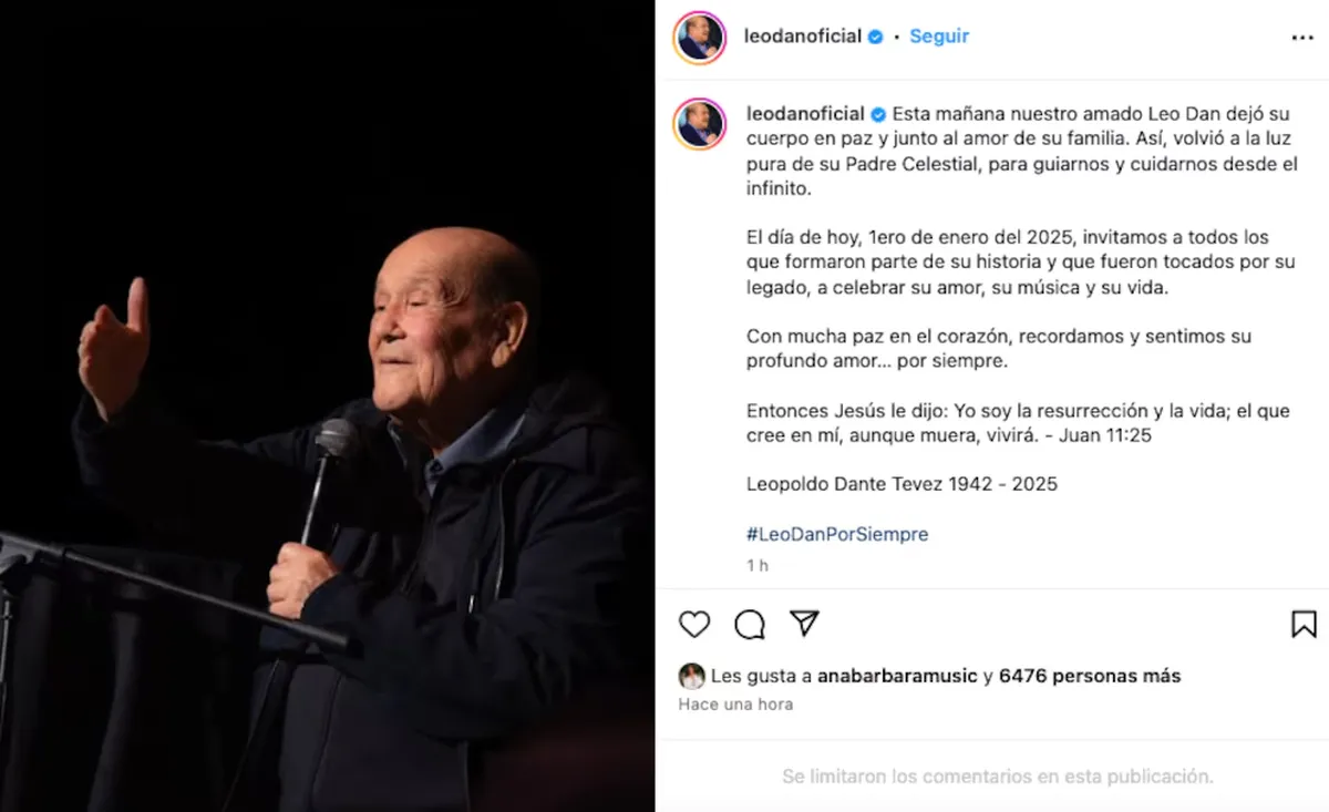 La noticia fue confirmada por la familia del músico a través de sus redes sociales, con un especial mensaje para despedirlo. “Esta mañana nuestro amado Leo Dan dejó su cuerpo en paz y junto al amor de su familia”, comunicaron.