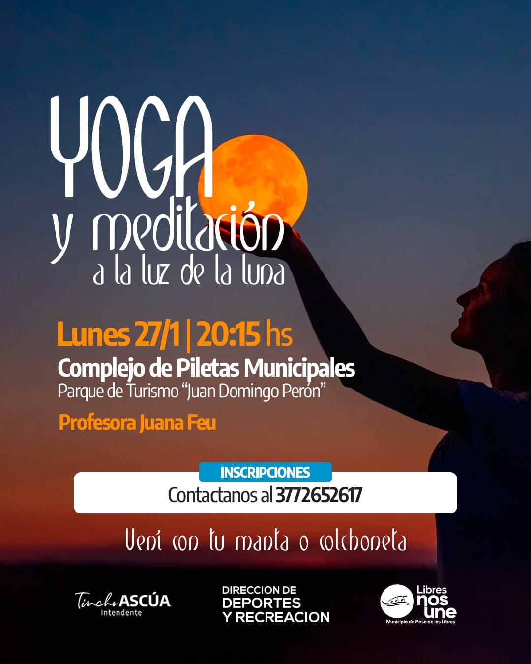 El próximo lunes (27/1) a las 20,15 horas, el Complejo de Piletas “Pedro Alberto Martinelli”, ubicado en el Parque Municipal de Turismo “Juan Domingo Perón”, será el escenario de una nueva Jornada de Yoga y Meditación bajo la Luz de la Luna.